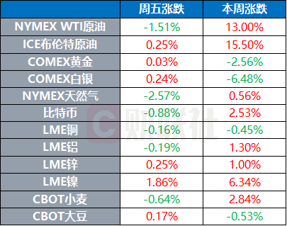 WTI原油期货结算价收跌1.51%,下跌1.45美元,报94.40美元/桶,本周累计上涨13%。布伦特原油期货结算价收涨0.25%,上涨0.26美元,报105.33美元/桶,本周累计上涨15.5%。